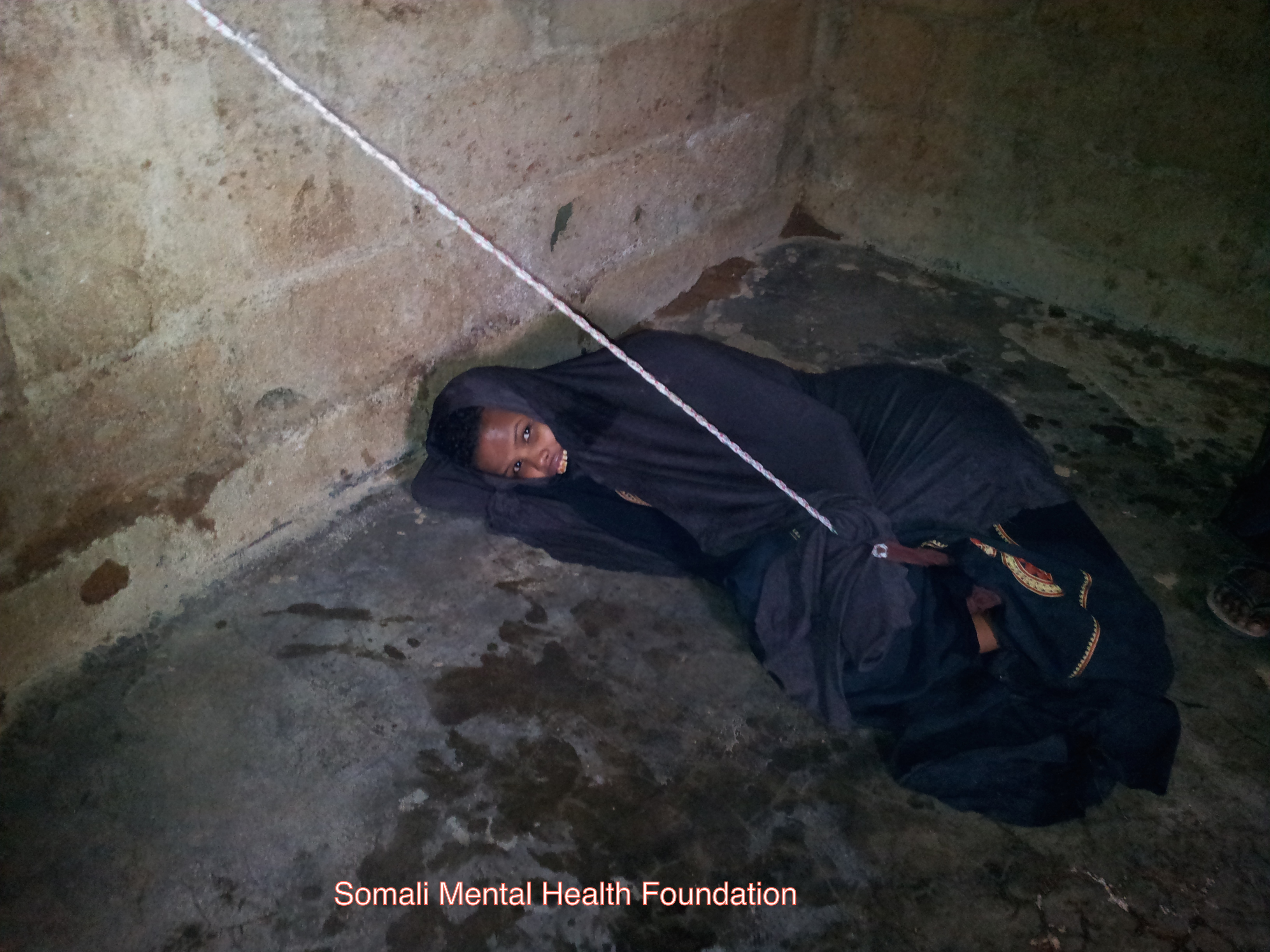 Issia A. Mohamed, a 18 year old teenager was stricken by psychological illness when she was four months old according her mother. As you can see in this picture taken by a visiting member in Garowe, Somalia, Issia is condemned in this small empty filthy room with a rope tied to her leg which is secured in the wall so she can’t harm her self or others. Issia is very lucky since she has her mother who is taking care of her and loves her. Issia depends completely on her mother’s assistance. The family is very poor and Issia’s condition and needs puts the family a lot of stress.
